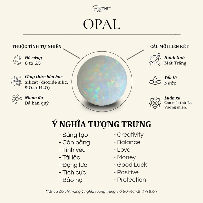 Opal được biết đến như một viên đá đại diện cho thế giới tâm linh và sự sáng tạo. Opal thường được tin rằng có thể giúp chủ nhân kết nối với tầng năng lượng cao hơn, khơi gợi cảm hứng và sự nhạy bén trong tư duy. Đá cũng thường được gắn liền với khả năng hỗ trợ giải phóng cảm xúc, lan tỏa năng lượng tích cực trong quá trình phát triển bản thân.