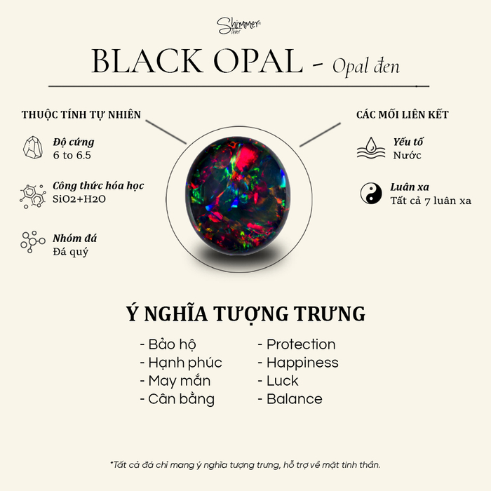 Trong các dòng đá Opal, Opal đen là dòng đá quý và cực kì đắt đỏ trong họ Opal. Opal đen khác với những loại Opal thường ở màu sắc cầu vồng nổi bật hơn nhiều và được cấu thành từ các nguyên tố vi lượng carbon và oxit sắt. Với nguồn năng lượng lớn, Opal đen thường được tin rằng có thể xua tan đi những năng lượng tiêu cực và mang đến hạnh phúc/may mắn cho chủ nhân 🌟